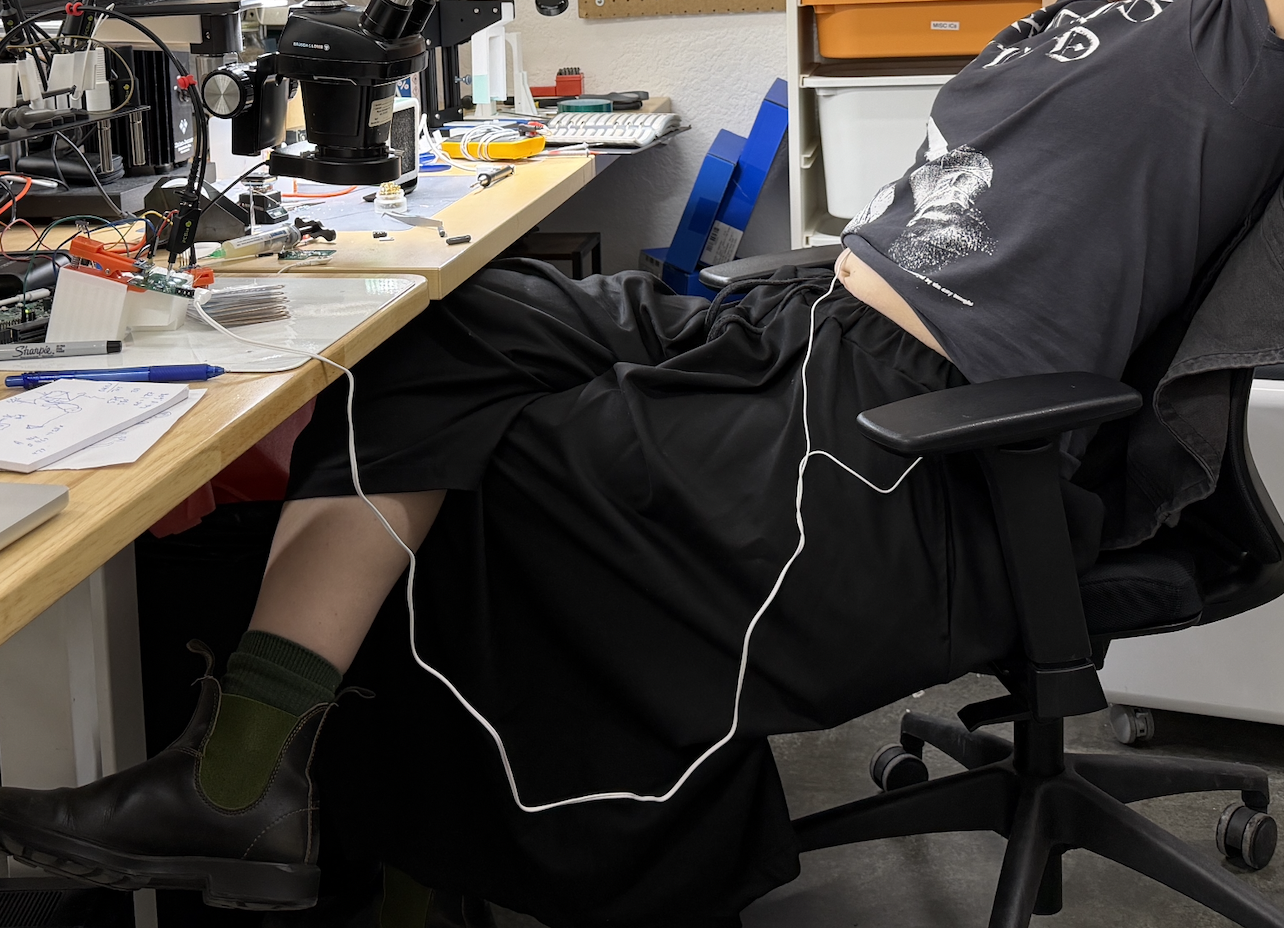 The most clunky part of any biosensing project is coupling the human to the circuit, and this was no different. We had to get EKG gel electrodes, corresponding snap electrode cables, and then connect them to the person in question. This is annoying because the electrodes are disposable, the wires are too long and windy, and the connection to the board is bulky because the EKG electrodes normally go off-body to get digitized.