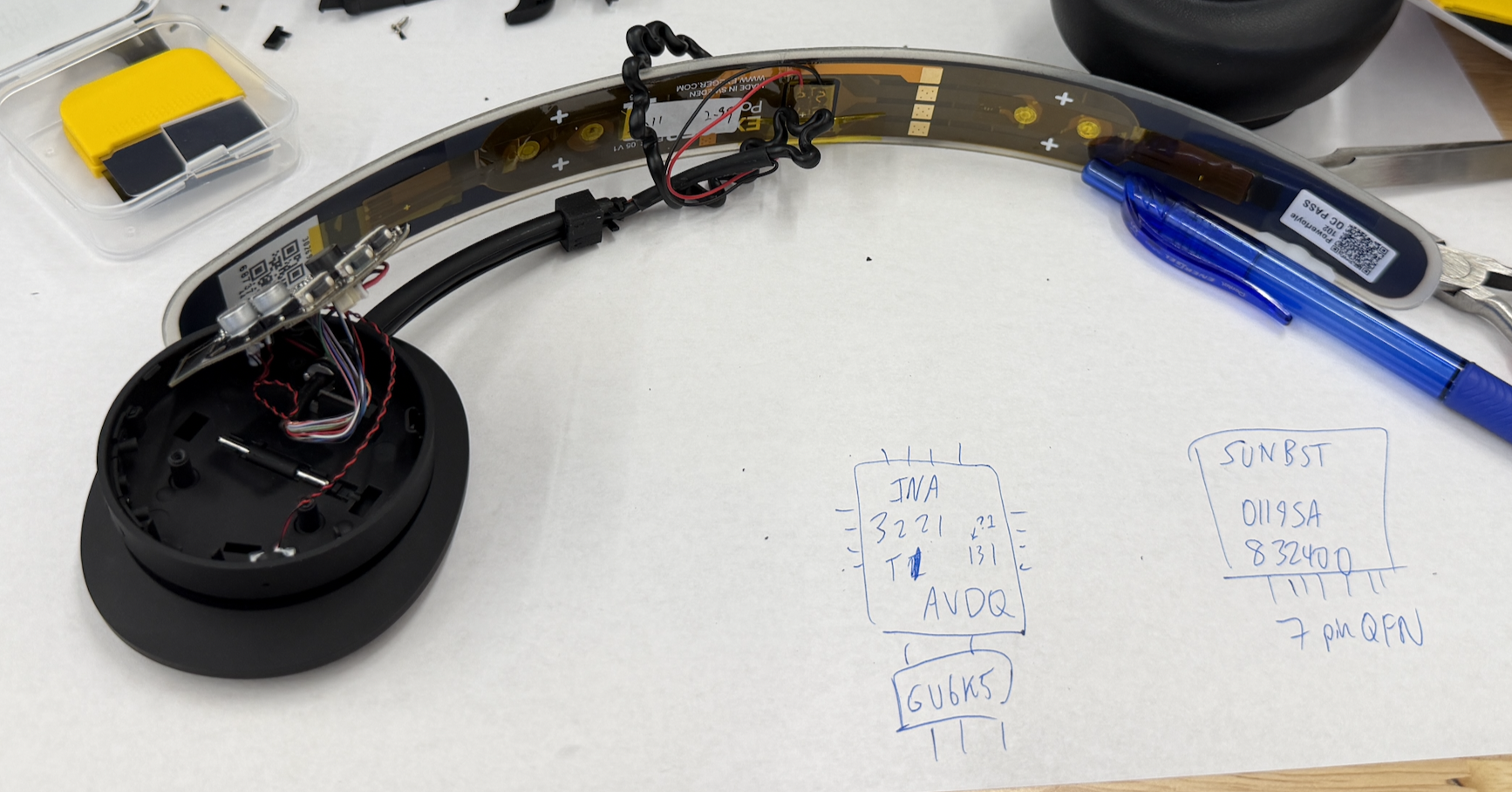 I used a clamp to pop off the two outer shell bits on the headphone themselves. The right one contains the harvesting and bluetooth chips (labeled on paper), and 2 mics for the noise-cancelling.